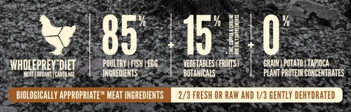 85% Poultry, Fish, Egg, and 15% Vegetable, Fruits, Botanicals - 0% Gluten, Grains, Rice, Tapioca, Potato